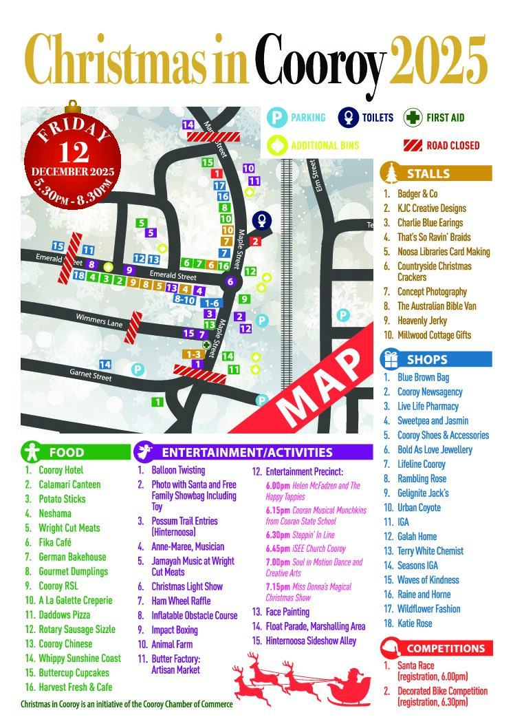 Get ready for a night of festive fun and community spirit as the Cooroy Chamber of Commerce proudly presents the 21st Annual Christmas in Cooroy!